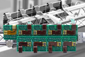 Afin de mettre en valeur le travail des électroniciens et celui des mécaniciens, j’ai composé cette image à partir de 2 vues. Au premier plan, l’image en couleurs, de la face « composants » des modules, et au 2ème plan, en noir et blanc et en perspective, l’arrière de ces mêmes modules, montés sur le « rail » qui assure leur positionnement et sert également de refroidisseur. »